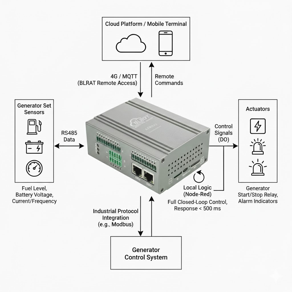 Generator Set Sensors (Fuel Level, Battery Voltage, Current/Frequency) → ARMxy BL335 (Core Gateway) → Actuators (Generator Start/Stop Relay, Alarm Indicators)