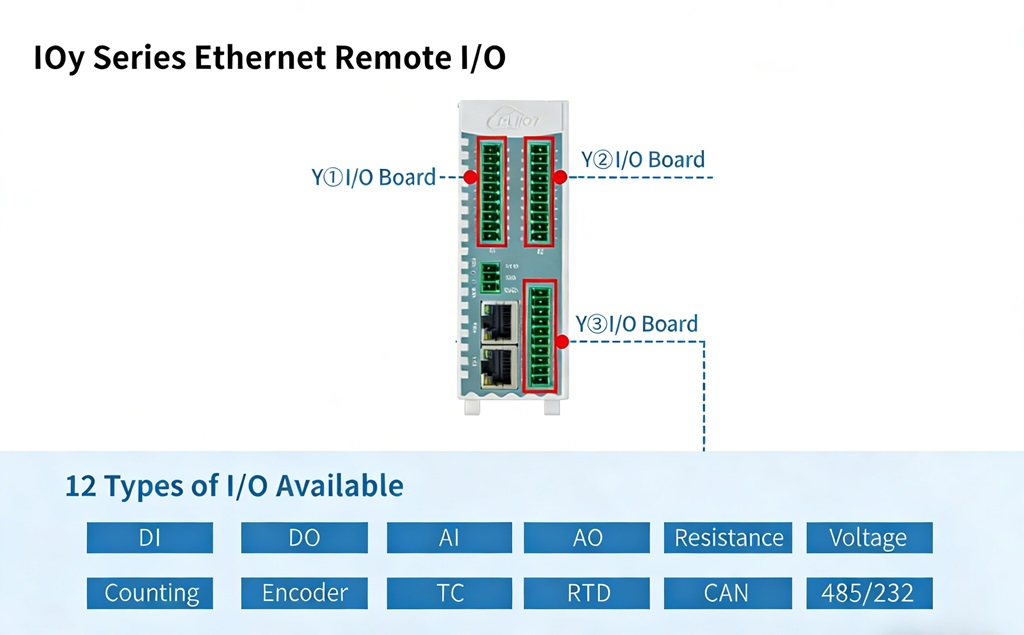 Modular I/O: Supports 1-3 Y-series I/O expansion boards, allowing flexible configuration of various signal types including Digital Input/Output (DI/DO), Analog Input/Output (AI/AO), Resistance Temperature Detector (RTD), and Thermocouple (TC), covering the vast majority of sensors and actuators.