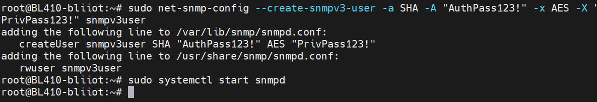 sudo net-snmp-config --create-snmpv3-user -a SHA -A "AuthPass123!" -x AES -X "PrivPass123!" snmpv3user