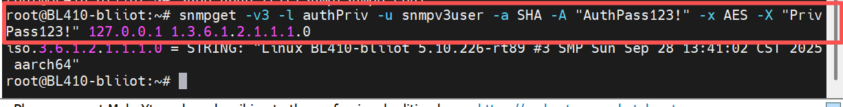snmpget -v3 -l authPriv -u snmpv3user -a SHA -A "AuthPass123!" -x AES -X "PrivPass123!" 127.0.0.1 1.3.6.1.2.1.1.1.0