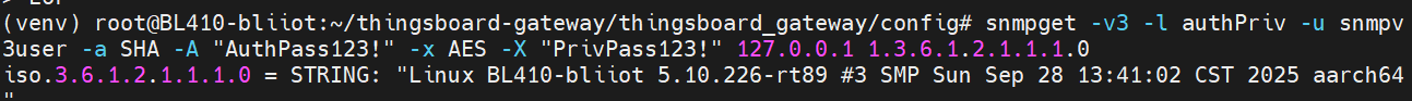 3. Verify the SNMP connection validity. Execute the SNMP v3 access command again to confirm that the connection between the Gateway and the SNMP emulator is normal: `snmpget -v3 -l authPriv -u snmpv3user -a SHA -A "AuthPass123!" -x AES -X "PrivPass123!" 127.0.0.1 1.3.6.1.2.1.1.1.0`