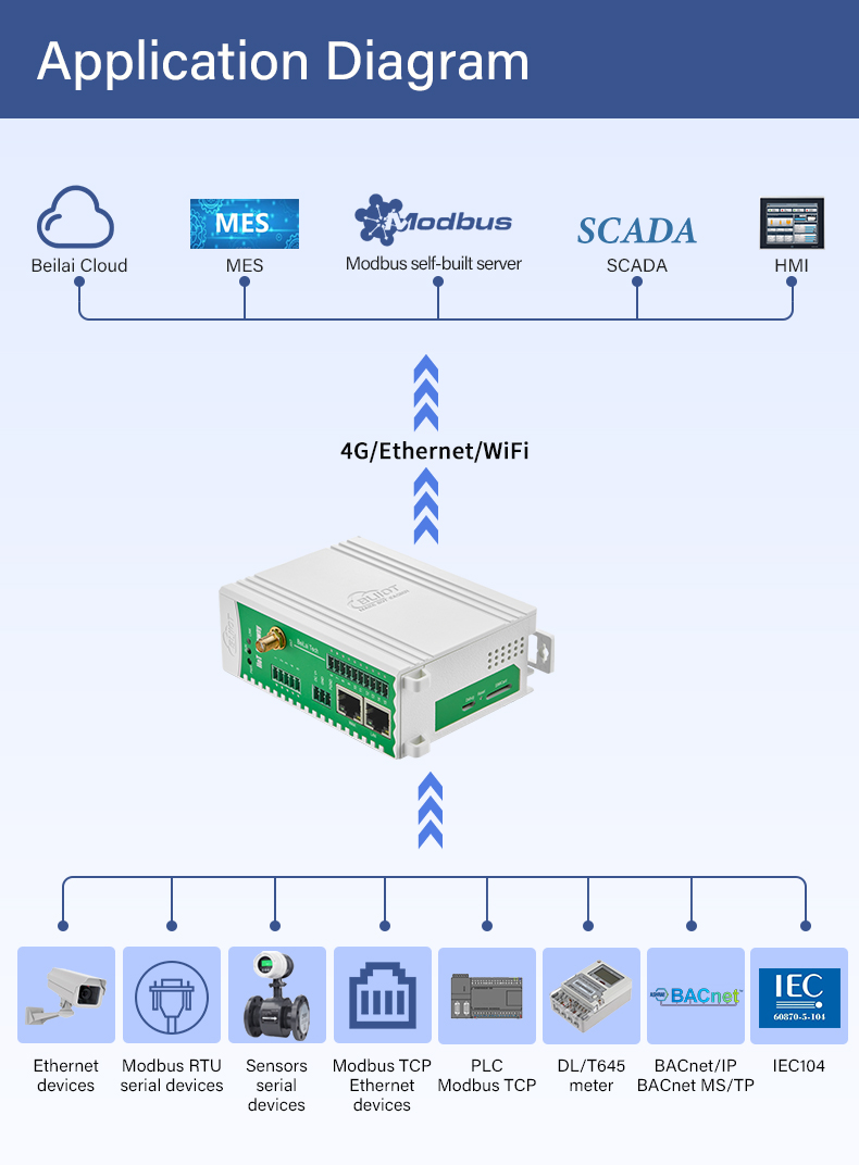The Beilai Technology air conditioning IoT gateway utilizes a high-performance industrial-grade 32-bit ARM processor, enabling high-speed acquisition of terminal data. Through standardized protocols such as Modbus, it transmits data in real-time to cloud platforms using protocols like MQTT.