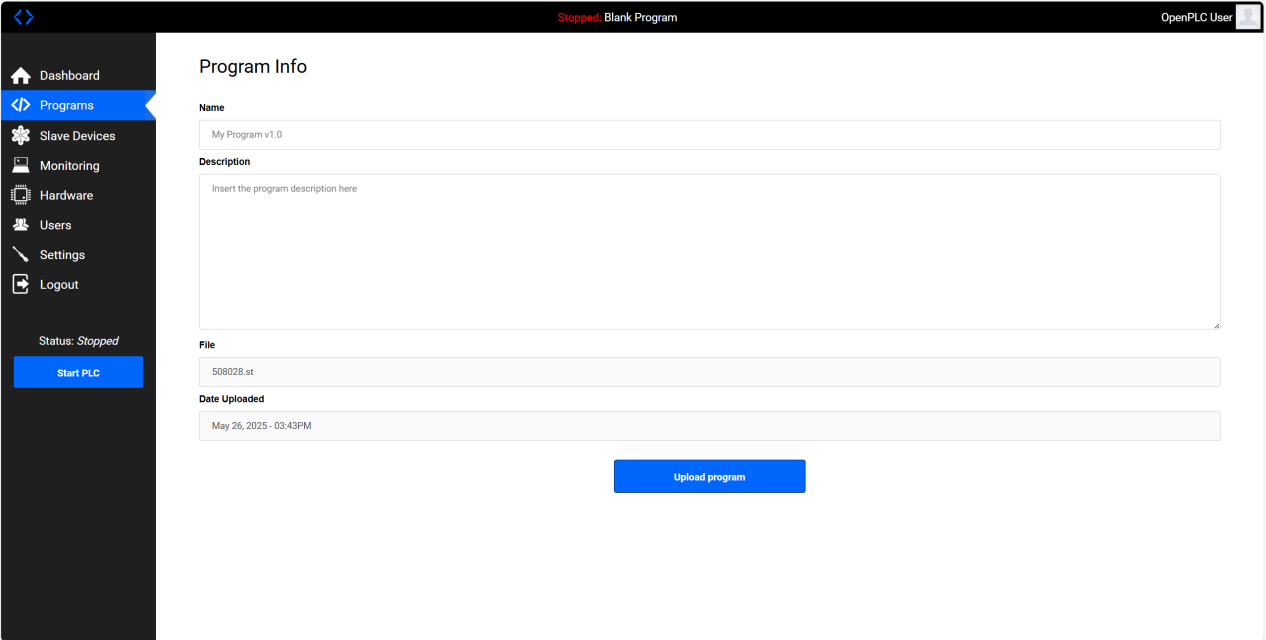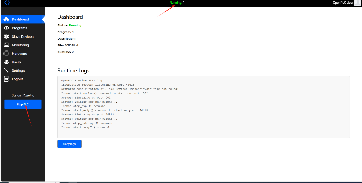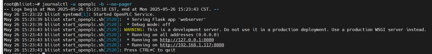 After installation, restart the device and check whether OpenPLC is running successfully by entering:
