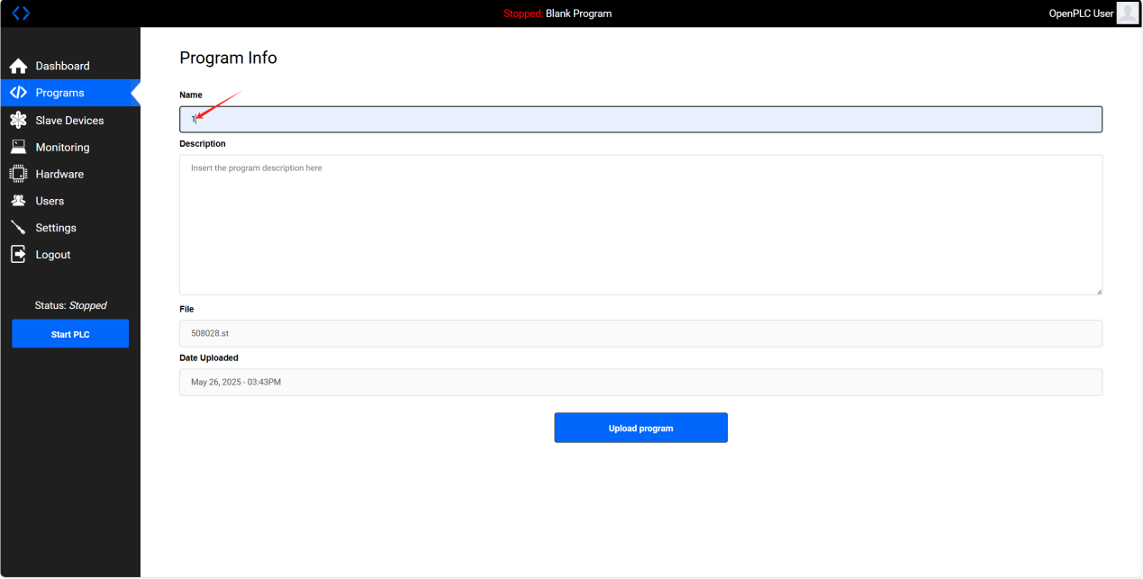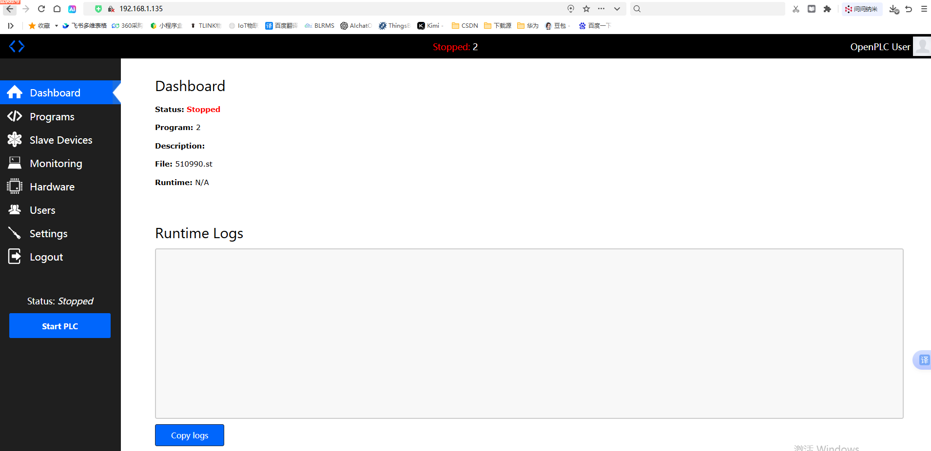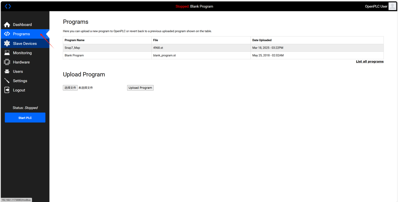 Here we enter the login interface of openplc. We log in with the default user of openplc. User: openplc, Password: openplc