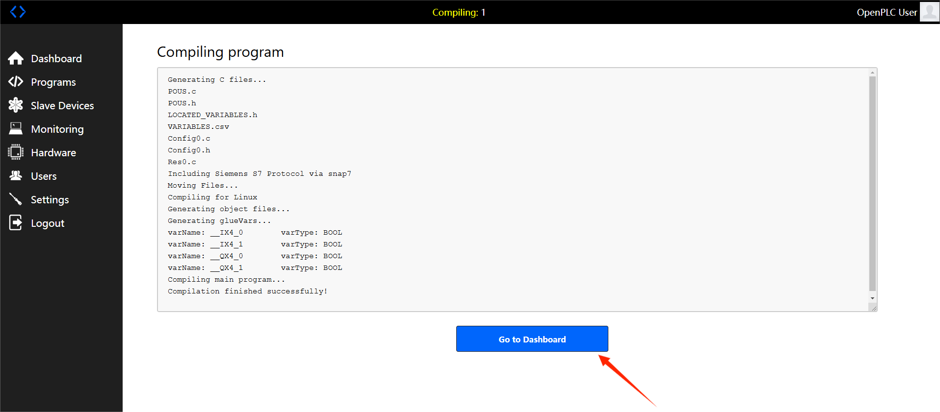 6. Click "upload program" below, wait for a moment, and click "go to dashboard" below when it becomes clickable.