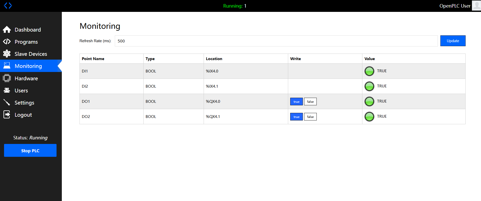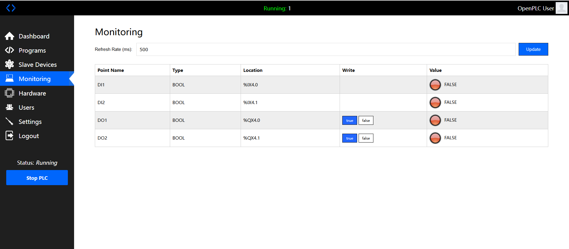 8. Click "start plc" to run the PLC. Under normal circumstances, the status at the top will display "running". If it does not display in time, please wait for a while or refresh the interface. If it fails to start all the time, you can click "start plc" again. If there is an error, please check the correctness of the PLC program.